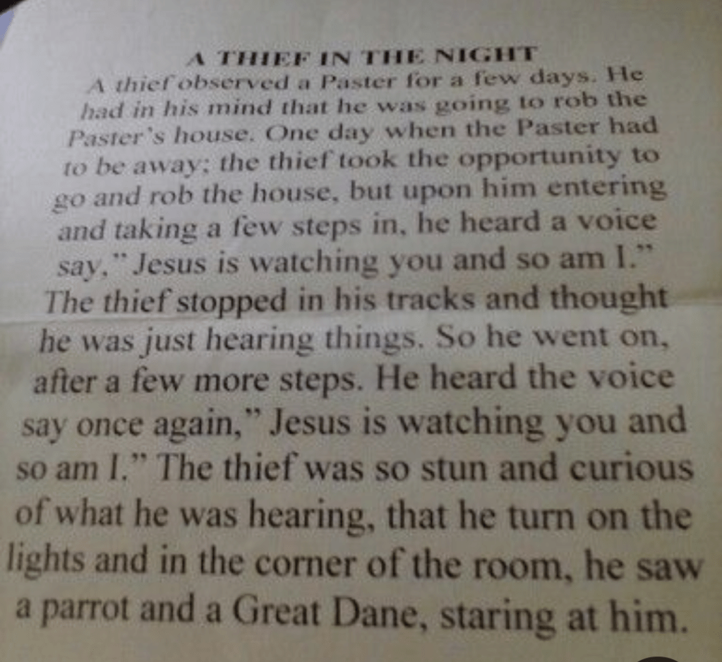 Our pastor had a way of telling stories so vividly that you just didn’t forget. We were discussing the second coming of Christ & how no one knows when He’ll be coming. If you knew, you would stay up all night & wait to welcome Him. Pastor told us how this to remind us He will come like a thief in the night, because again you don’t know a thief is coming, so you are not ready. He wanted us to live every day as if it was THE day so we could be ready & not be surprised or not be ready. Live a Godly life.